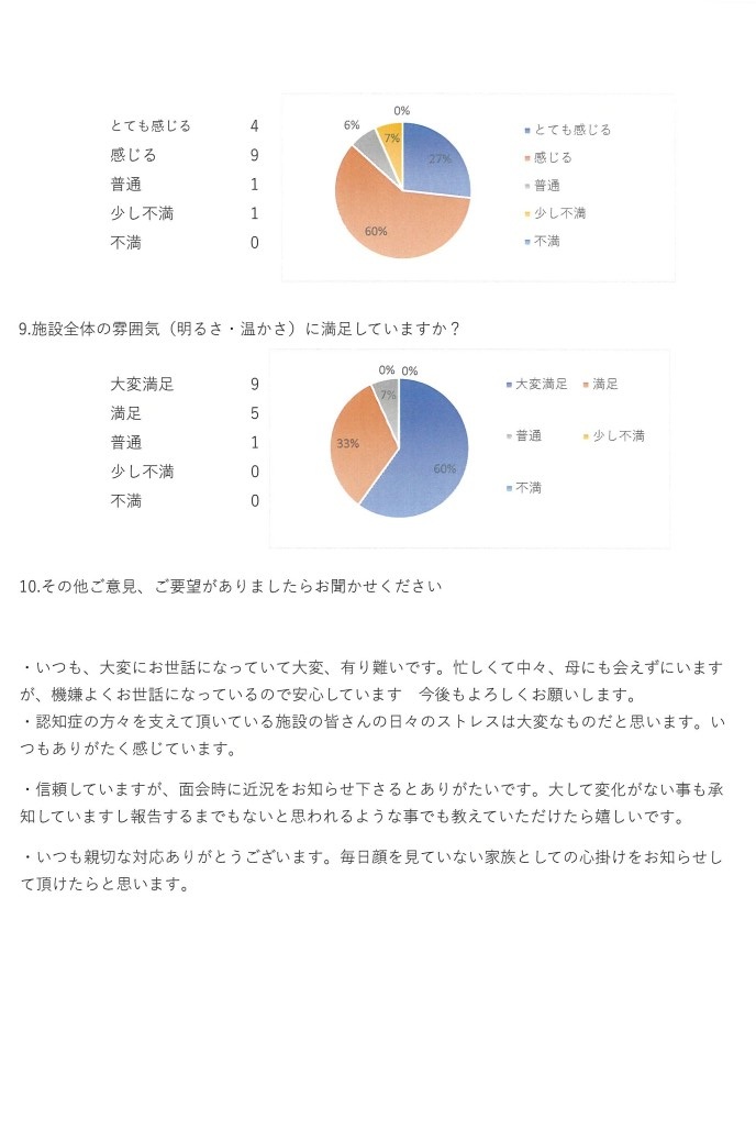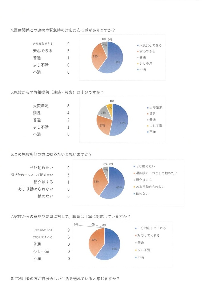 2025-05-02令和6年度 短期入所老人ホーム青嵐荘 ご利用者ご家族様アンケート集計結果令和7年2月に行いました短期入所者ご家族様アンケートに対し、お忙しい中たくさんの率直なご意見・励ましのお言葉をいただきまして、心より感謝申し上げます。皆様からの貴重なご意見を参考とさせて頂き、更なるサービスの質の向上に努めてまいります。